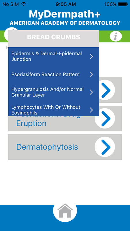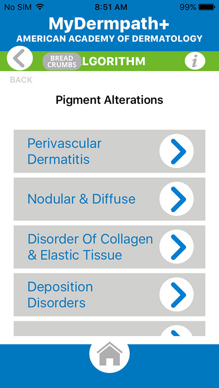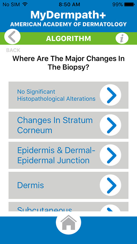 The algorithm first asks the question about the location of the major changes in the biopsy, such as epidermis, dermis, subcutaneous, etc. Depending on the location, users would be asked to indicate more specific histological characteristics through a series of algorithmic questions that would help them narrow the diagnosis. Users can also navigate through algorithms by tapping on Breadcrumbs button.
