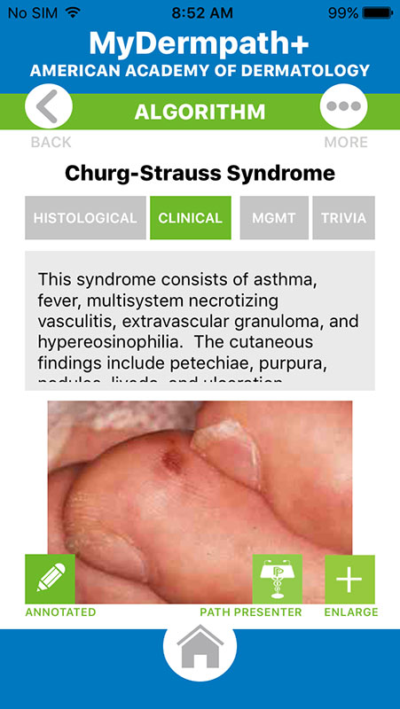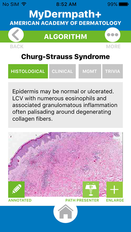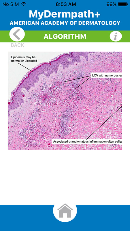 The most important feature and the core of this app is the Algorithm section, which enables users to identify specific dermatopathology conditions by selecting various histologic characteristics.