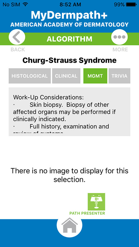 Once the algorithm is completed, a page for a specific condition would open including a text-based histological and clinical descriptions with photos for both, along with management recommendations and trivia.