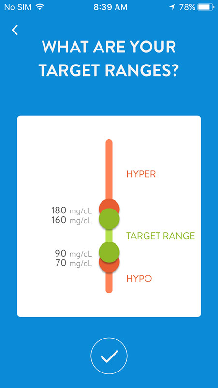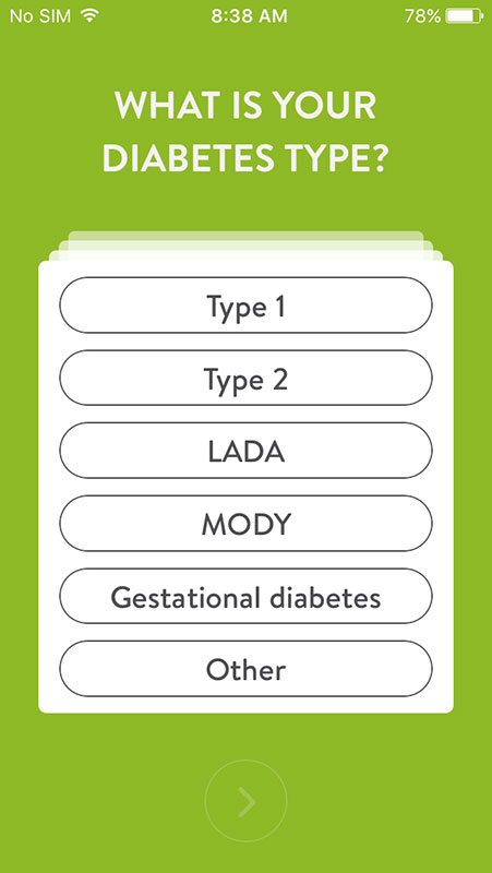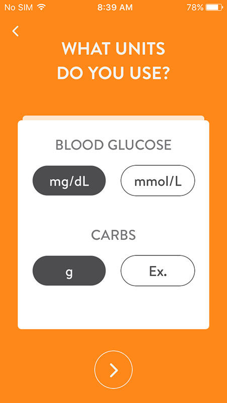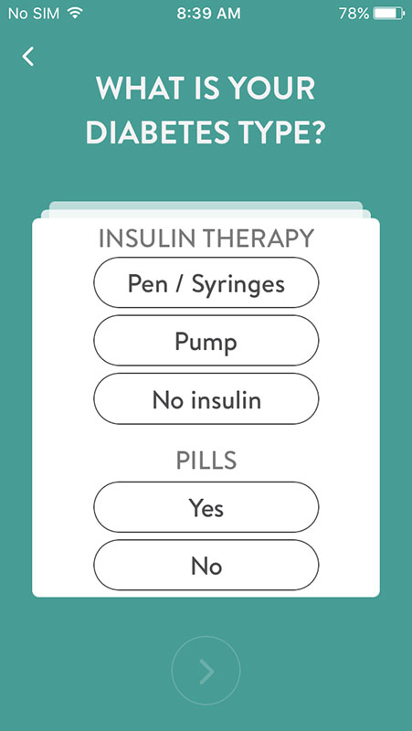 After downloading the app, you'll be asked to register with your email address and password. After that, you'll be asked questions about your diabetes, offering multiple choice answers, including the type of diabetes you have, the therapy you use (whether or not you need insulin, are you using pills), units for carbs and blood glucose you'd like to use, and your target ranges.