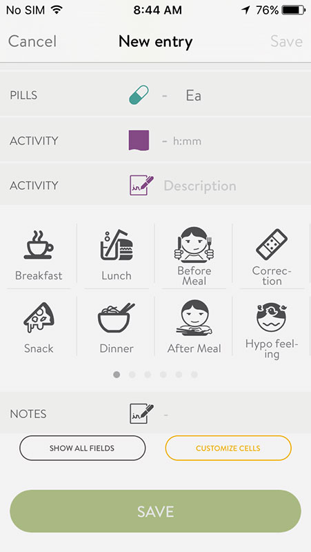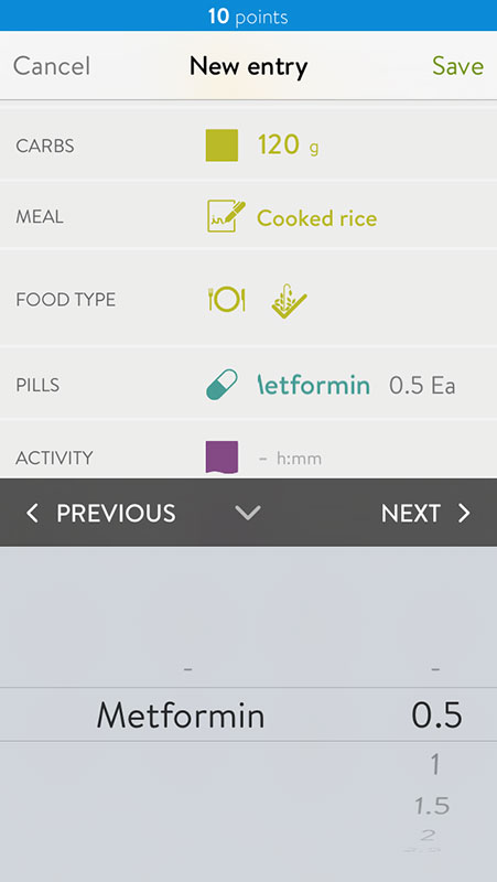 mySugr app allows you to log a lot of things relevant to your diabetes management, including blood glucose (in unit you've chosen after the registration, i.e. mmol/L or mg/dl), carbs (also in unit you've chosen), meals, activity (with duration and type), pills (if you use any). Entries, such as meal and activity, allow you to add additional descriptions alongside them. Users can also add the geographical location for each entry which is a nice addition.