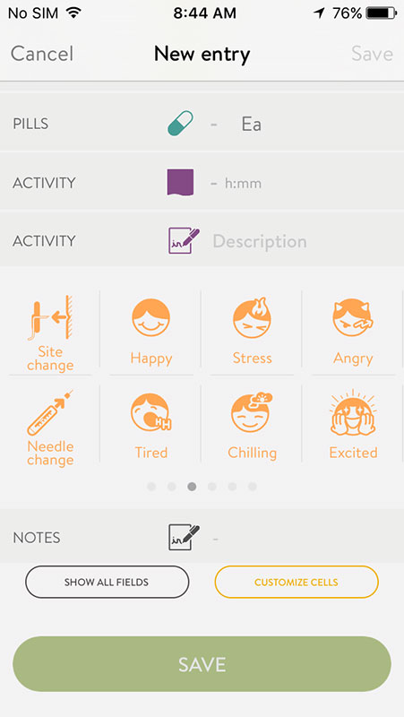 You can add further detail to your records by tagging these entries with one or more predetermined icons located at the bottom of the screen. These icons range from the essential meal and activity icons, such as breakfast, lunch, dinner, sports, travelling, shopping, house or office work, to more emotional options like happy, sad, stress or chilling.