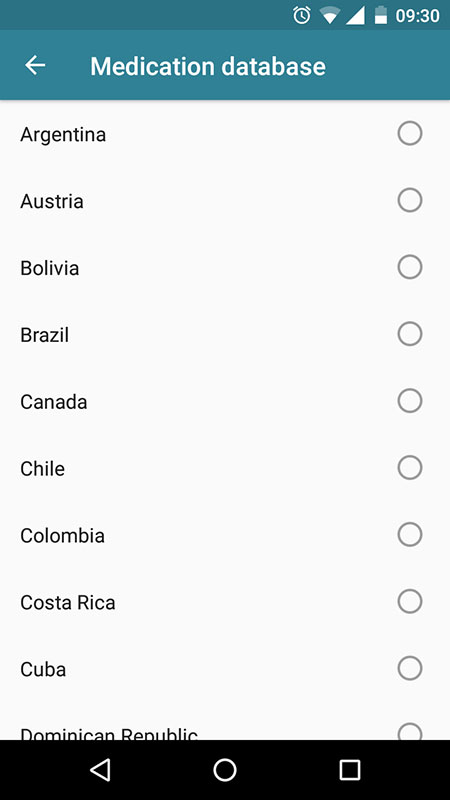 To add a reminder and start tracking you should first add medications. The app contains various medication databases from different countries, listed alphabetically. You can select the database in Settings.