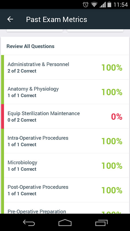 The exam is not time limited, but it has a timer indicating how much time you needed for the exam, which is included in the metrics. Each area of surgical technology exam preparation is covered with one question, except for Administrative & Personnel, and Equip Sterilization Maintenance that have two questions each.