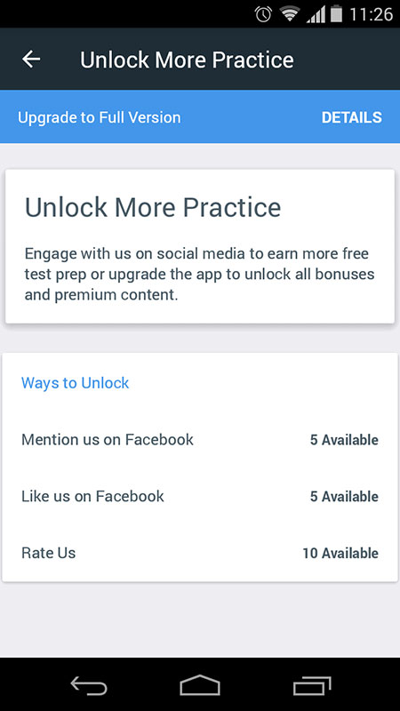 The app opens to the Dashboard with several options, such as today's practice question, days left until exam (tap on it to set the date) and total correct questions answered. Also, you can check past exam metrics or unlock more practice by engaging with the app on social media (mention, like or rate give you 5-10 additional practice questions).