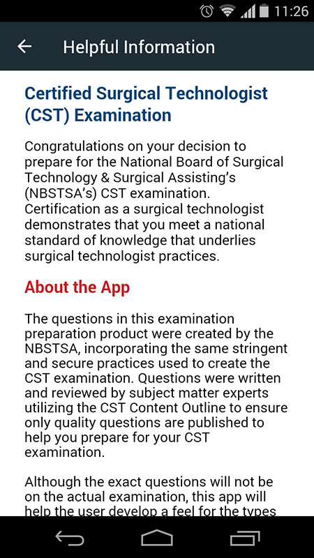 The National Board of Surgical Technology and Surgical Assisting (NBSTSA) created the official CST Examination Prep app for Android and iOS devices to help future surgical technicians and technologists study on-the-go.