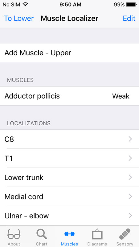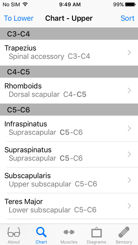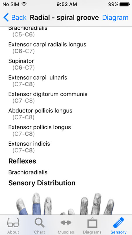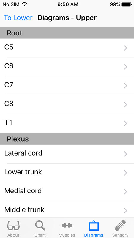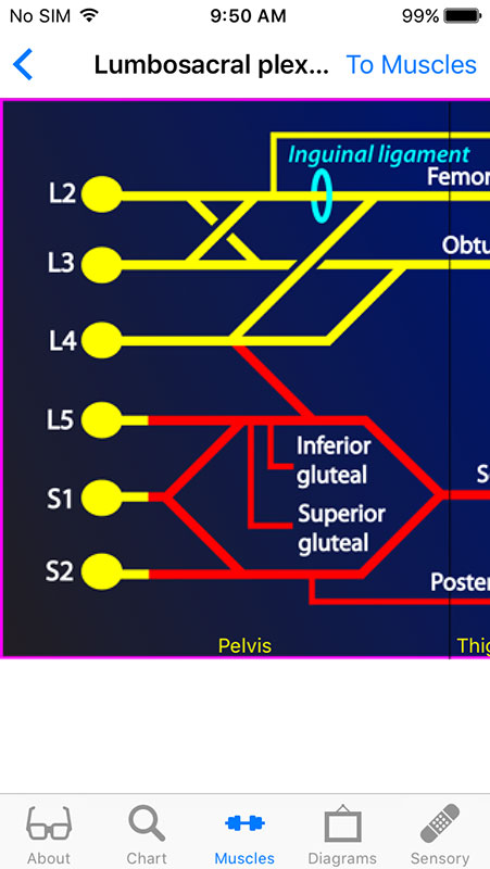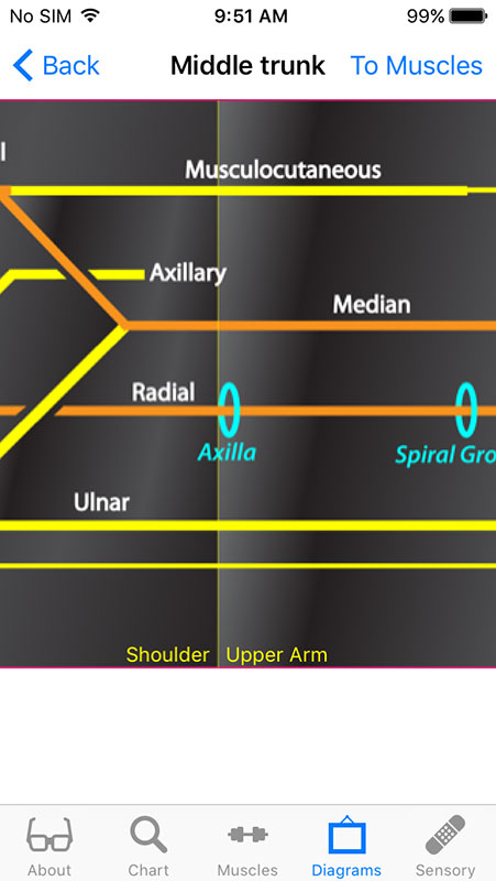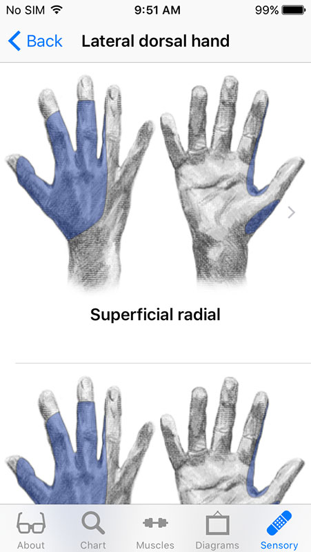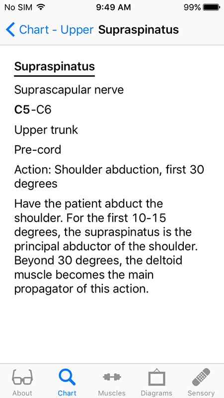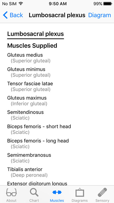 This section provides information similar to the information from the Charts section, but more detailed. There's also an option to view interactive diagrams explaining the nerves and associated muscles in a linear fashion that can be swiped left or right, or rotated horizontally.