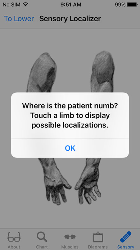 The last section of the app is the Sensory section that contains diagrams of the upper and lower limbs. Users can tap on them and that would open a new page containing the body part chosen (for example hands) with highlighted spinal nerve roots that provide sensory innervation to the selected area.