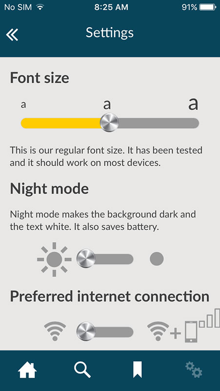 Navigation is easy. There are forward and back arrows at the bottom of each page, allowing you to browse through guidelines chapters easily or to get back to previous screen or exit the guidance and return to home page. Each guideline can be bookmarked, and accessed later via Bookmarks tab on the home screen. You can also access recently viewed guidelines, also from a main screen using View history tab.