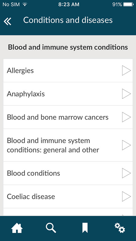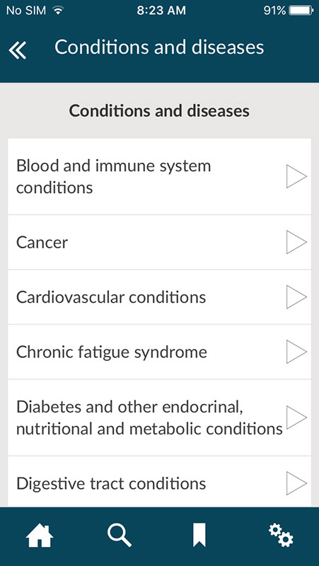 If you choose to browse by topic, the first option is Conditions and diseases, which basically lists all NICE clinical guidelines alphabetically, from blood and immune system conditions, cancer, cardiovascular conditions, to skin and urological conditions. Tapping on each of these conditions opens either guidelines for that condition or subcategories within the condition (for example different types of cancer). Some guidelines will repeat, depending on if they belong to two or more categories (for example renal cancer will be listed in both cancer and kidney conditions categories).