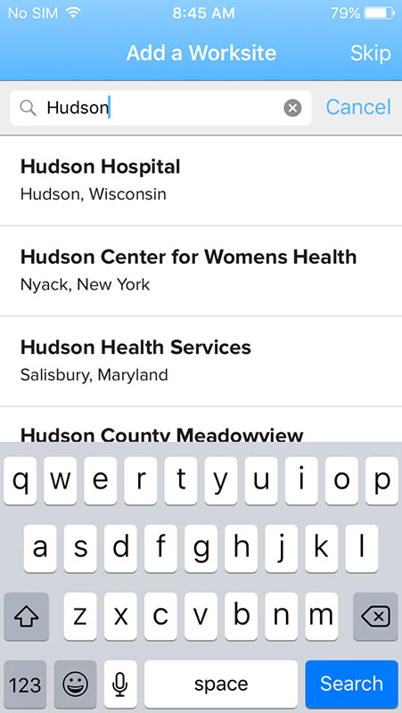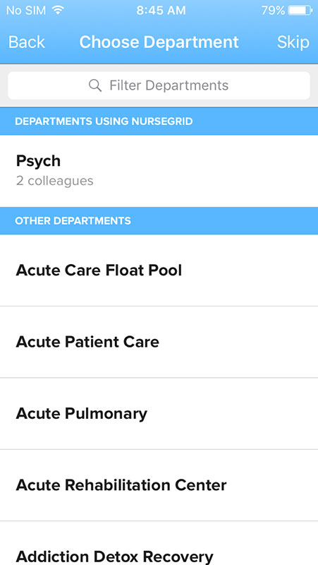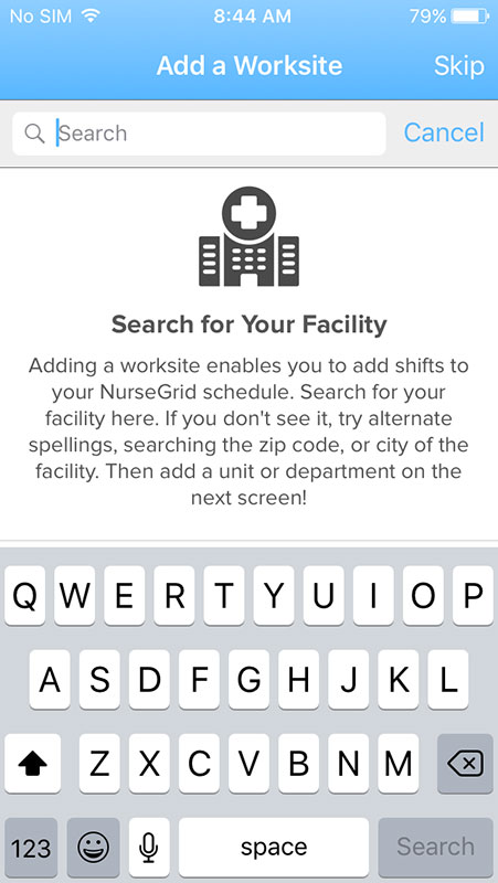 To add your facility, start typing its name in the search field and the autocomplete feature would populate the list as you type. This works pretty fast, and NurseGrid app includes most (if not all) hospitals and healthcare facilities across the U.S. After you've chosen your facility, you can proceed and add unit or department.