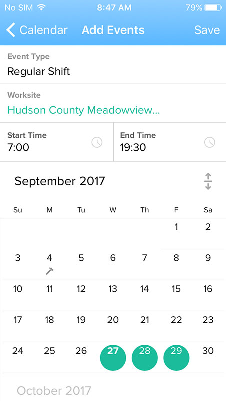 If you haven't added your worksite, that will be the next step, along with start and end time. Finally, you need to tick all the days in the calendar for a particular event.