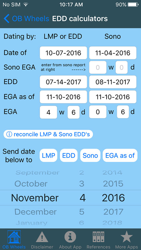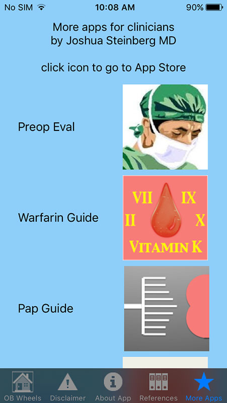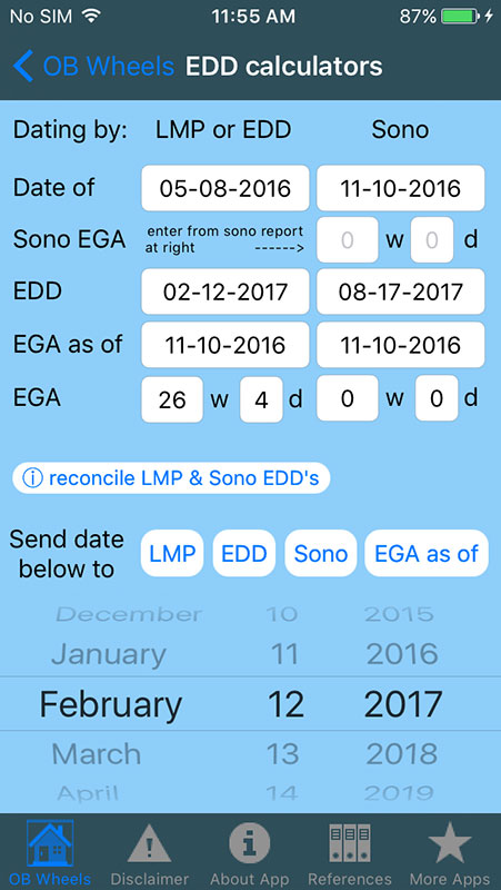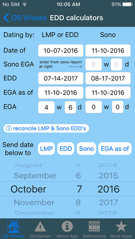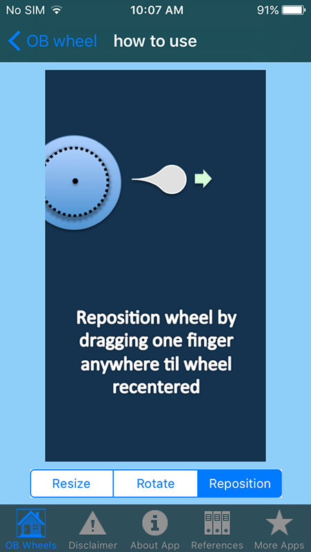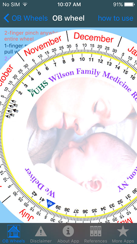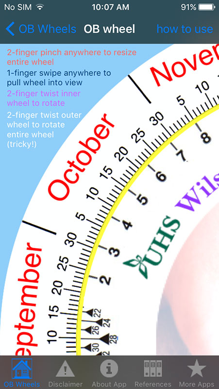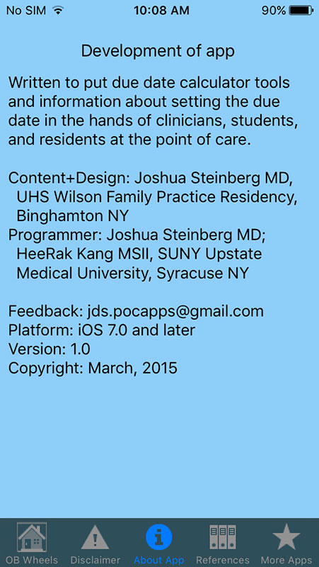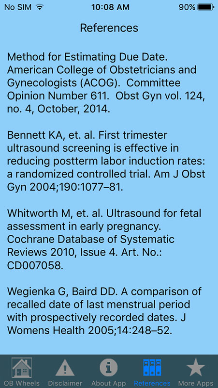 There's a list of useful references at the bottom of the home screen, as well as disclaimer and information about the app. It should be noted that the OB Wheels app incorporates the most current ACOG guidelines and standards for dating pregnancies. There is also a list of other apps made by Dr. Joshua Steinberg, you may find useful.