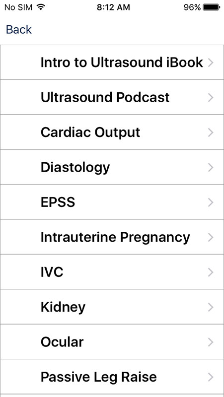 Upon opening the app, you'd notice the simple layout featuring six ultrasound procedures, including FAST (Focused Assessment Sonography in Trauma), Gallbladder, DVT, Aorta, Soft Tissue, and Wall Motion (Cardiac).