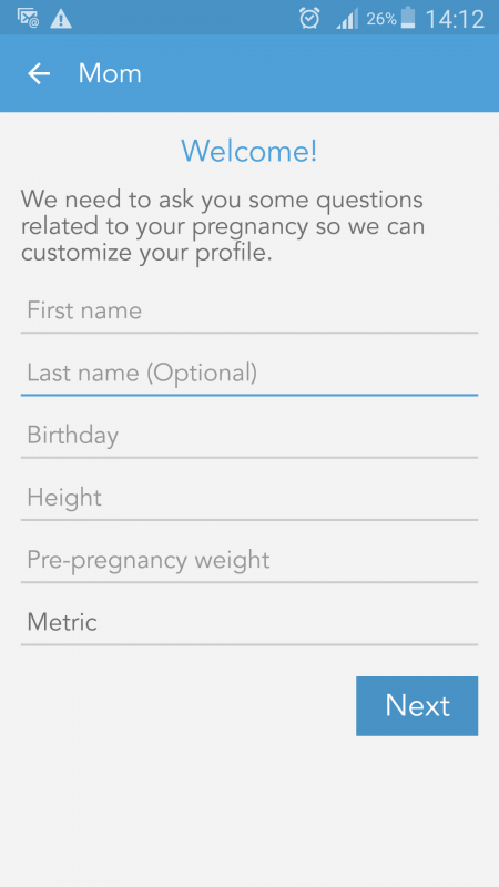 When I access the application, it opens up to a welcome page asking me for personal information such as my name, surname, date of birth, height and pre-pregnancy weight. This is a very nice feature as the app immediately makes the point clear that this is a personalized application where the information that is going to be accessed is going to be unique to the user.