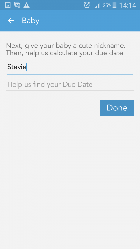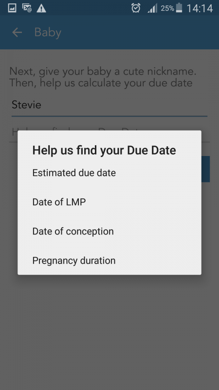 Once you're done adding this info and click "next", the app then asks you for the baby's "nickname" and there's a feature where they help you determine the baby's expected date of delivery. The drop down screen asks for your estimated due date, the first day of your last menstruation (LMP), the date of conception or the current duration of the pregnancy.