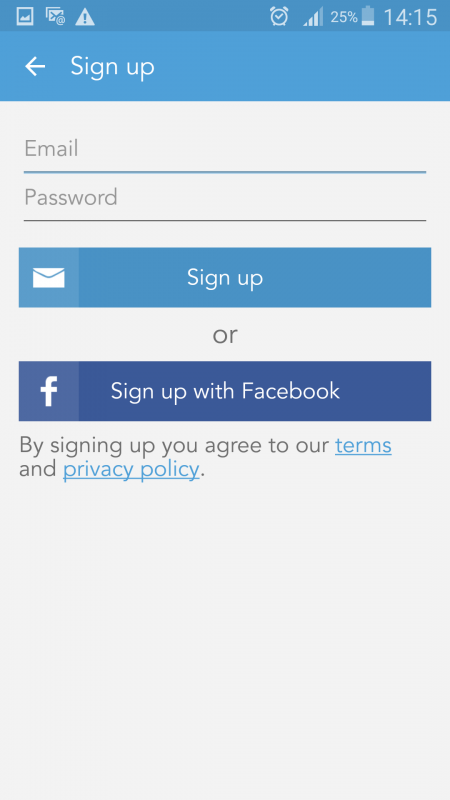 Once all this data is imputed, the app moves onto a login screen where you can enter your email and password or enter your Facebook login details.