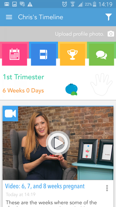The app then opens up to a home screen where you will notice that the timeline is described with your name, for example, "Mary's Timeline", and that the app states your current gestational period (time of pregnancy). When you scroll down the screen you will see that all the information listed is relevant to your time of the pregnancy such as personalized pregnancy articles, weekly baby development milestones and real-time feedback on your symptoms. There's even a picture of what your baby looks like at this stage as well.