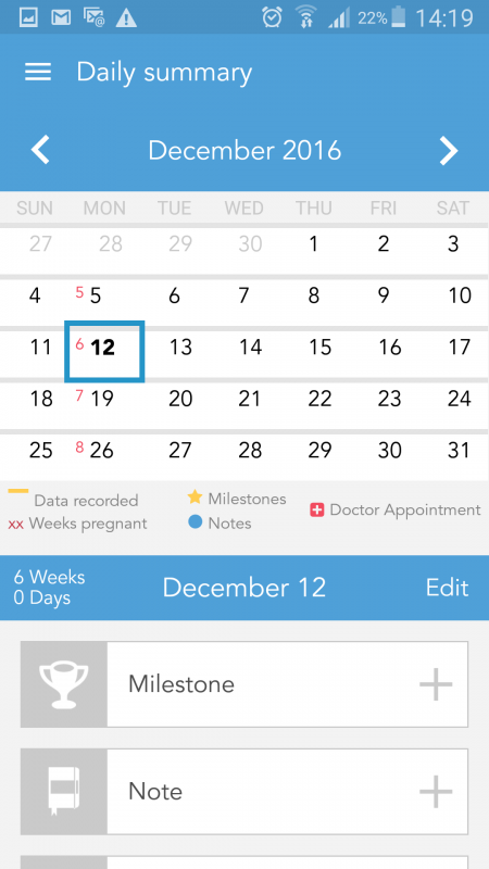 The blue tab opens up the "daily summary" page where you will find a calendar where you can see at what weeks of the year the weeks of your pregnancy fall on. You can use this section to set up your doctor appointments, make notes of products that you need to buy, write down what symptoms you had on specific days, baby names ideas, etc.