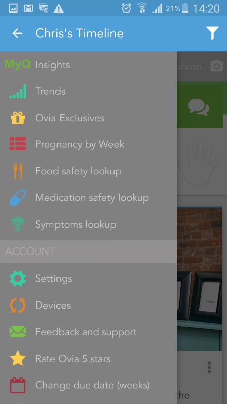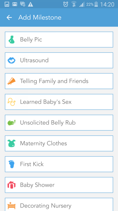 The next tab is the yellow trophy tab which takes you to a page where you can monitor milestones such as upload pictures at different stages of your pregnancy, when you told friends and family of the good news, when you found out the gender of the baby, when you felt your first kick, when you had your baby shower and when you started decorating the nursery.