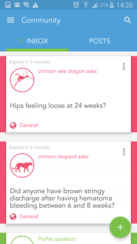 The last green tab opens up the "community page" where the user gains access to a chat room where other users of the app are asking each other relevant questions and giving advice to those who asking certain questions.