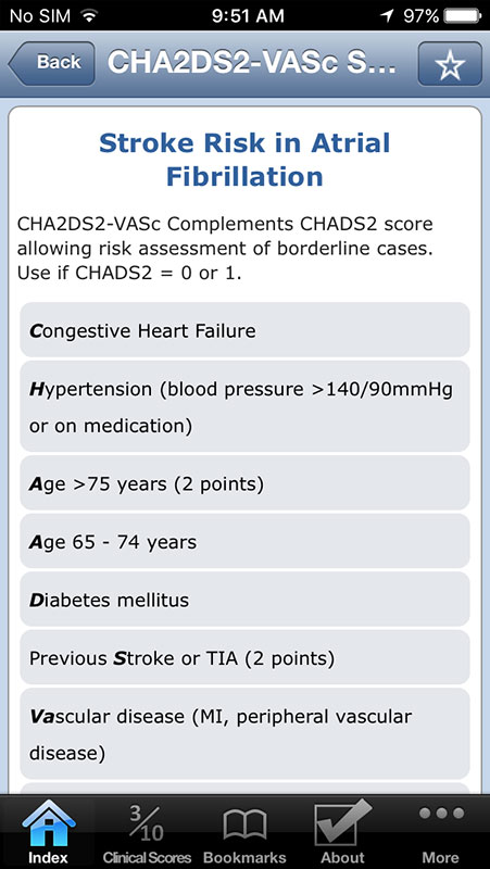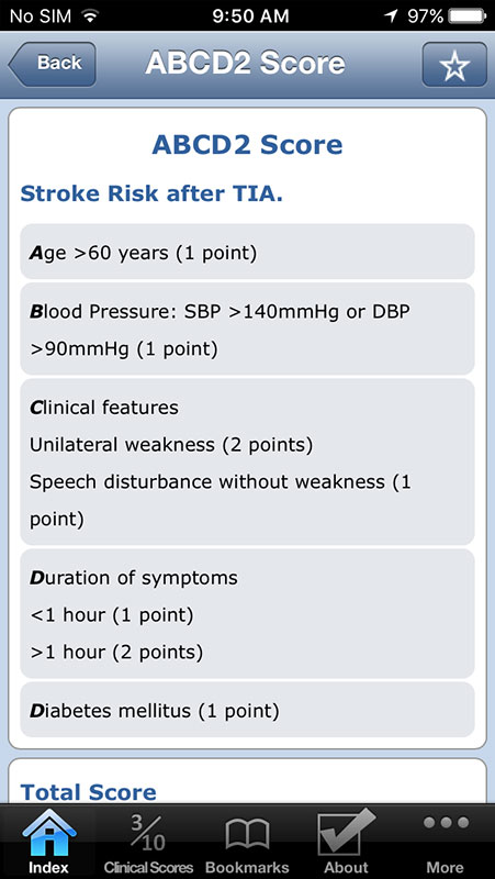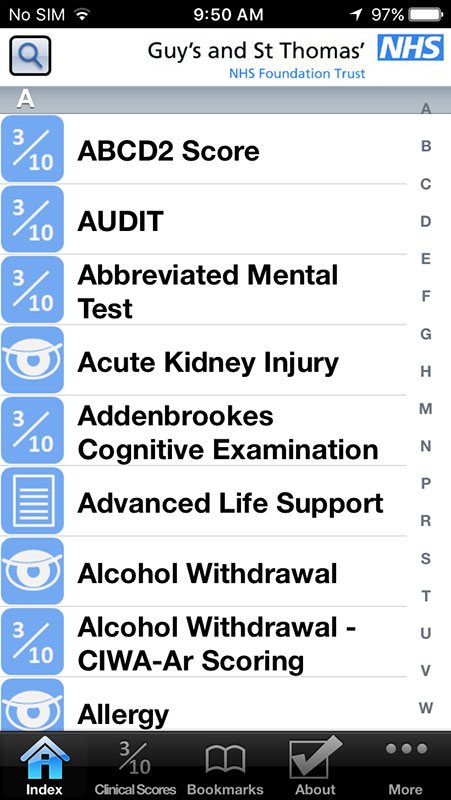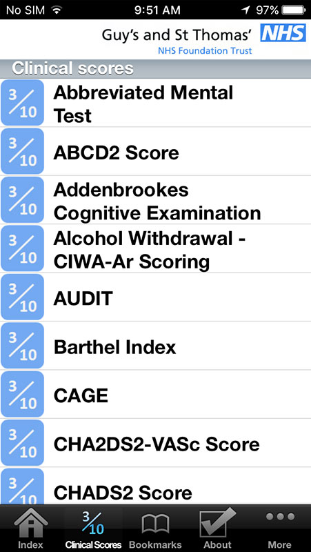 Each of the references listed on a home screen, has an icon beside its name telling which category it belongs to. 3/10 icon is designated for Clinical scores category that can also be accessed by taping on the same icon in the footer. Clinical scores are also listed alphabetically, ranging from Abbreviated Mental Test and ABSD2 scores to Wells Score and WHO Performance Categories.