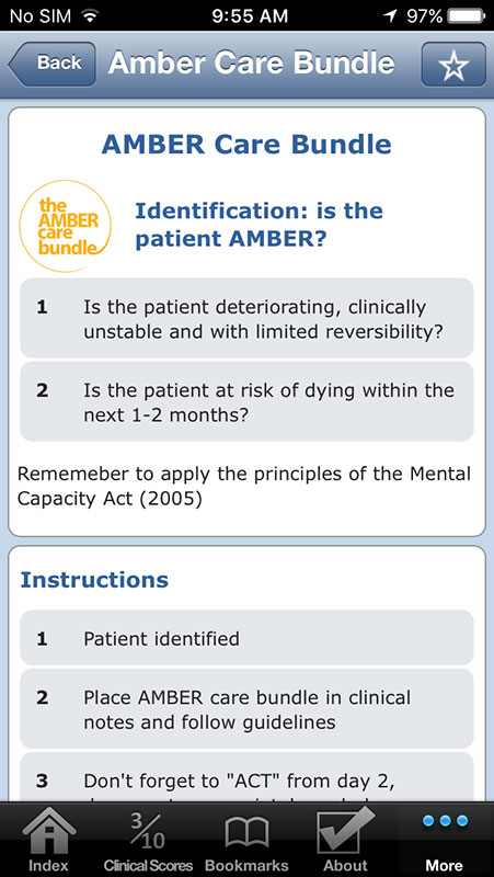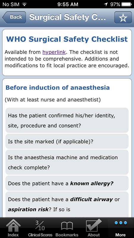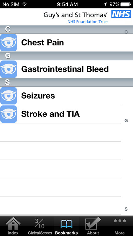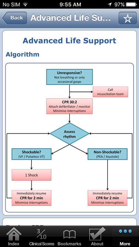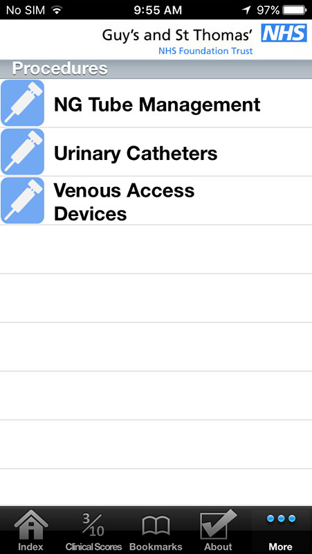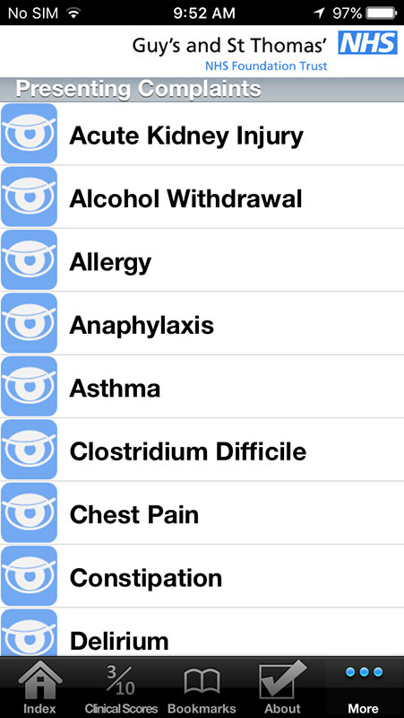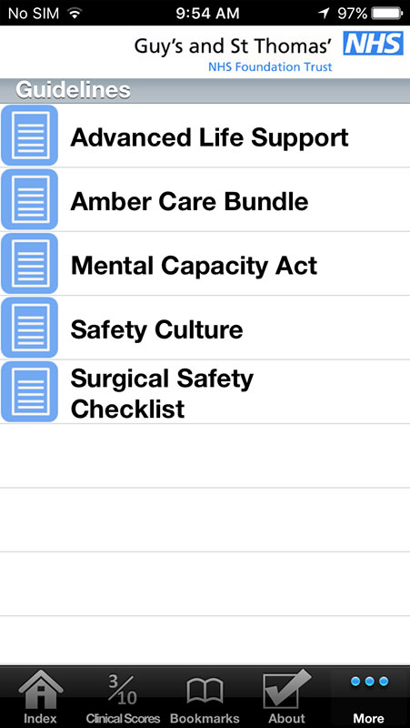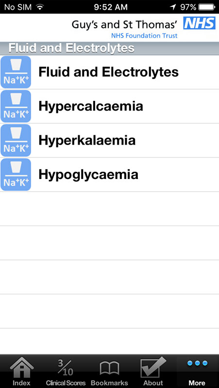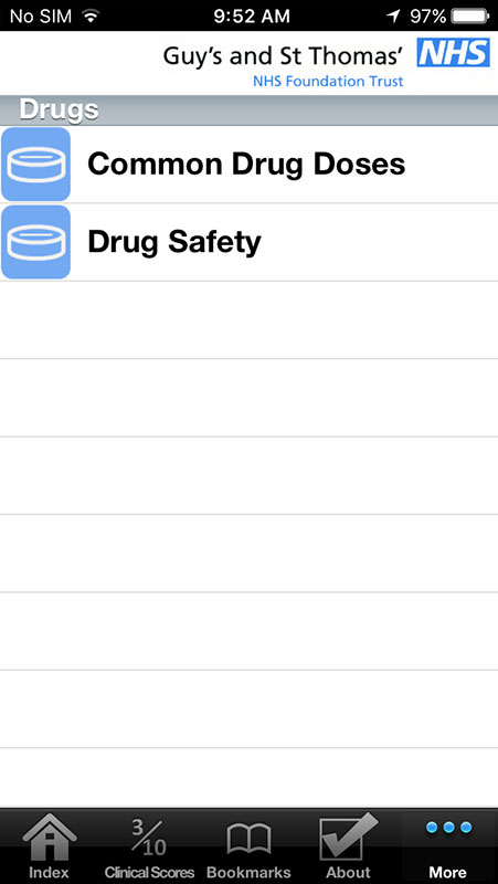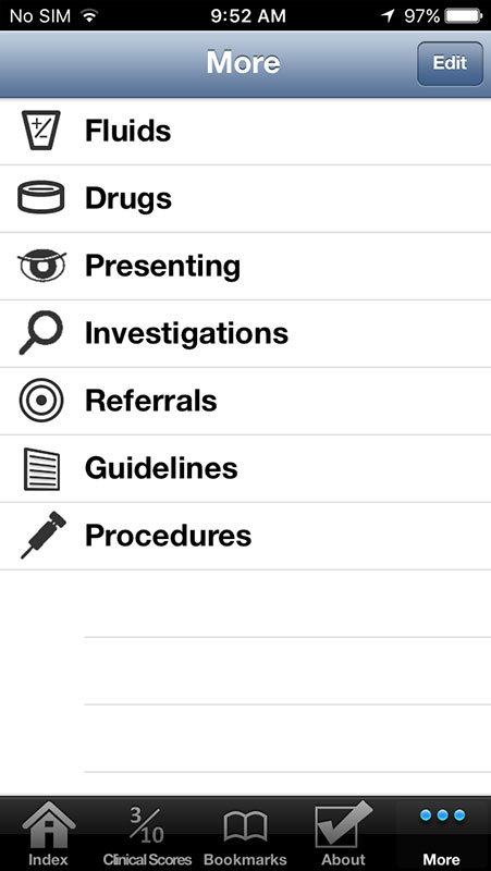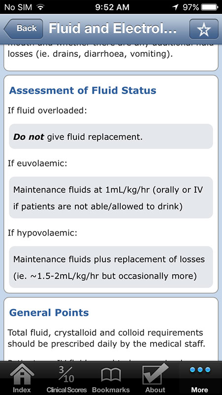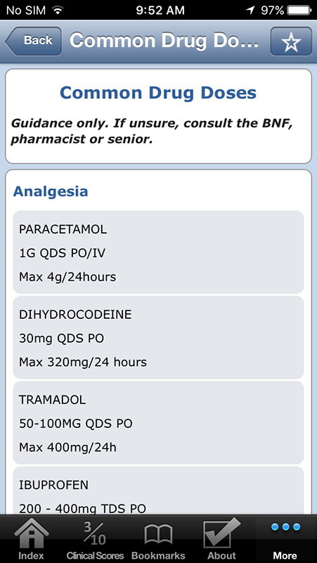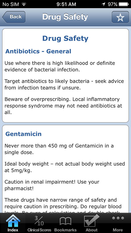 While the design and interface are pretty simple and straightforward, some things could be fixed for better user experience. For example, Index tab is useless, because all sections are listed and accessible elsewhere. It would be better if some more useful sections, for example Presenting, which lists guidance for common clinical situations, is shown on home page. Same applies to Fluids, Drugs, Investigations and Procedures sections, which shouldn't be hidden within More tab (About tab is more suitable for that).