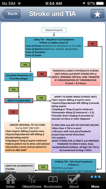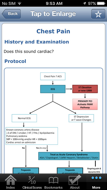 Information in some of these guidelines is quite scarce, such as in part about allergies, while some information is available in separate app, such as deep venous thrombosis. Parts about chest pain and stroke contain useful graphs explaining the protocol from the patient's admittance to the risk evaluation and recommended further actions.