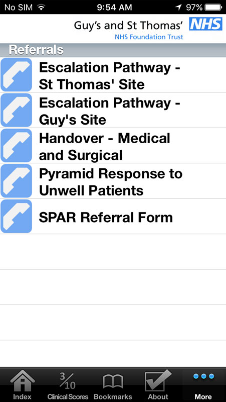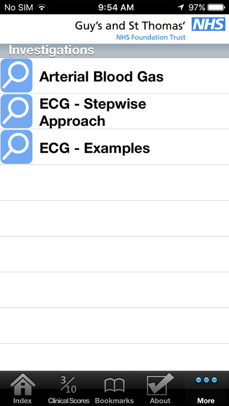 Besides Clinical scores, you can access other reference materials by tapping on More tab in the footer. You'll see them listed in similar fashion with associated icons beside each.