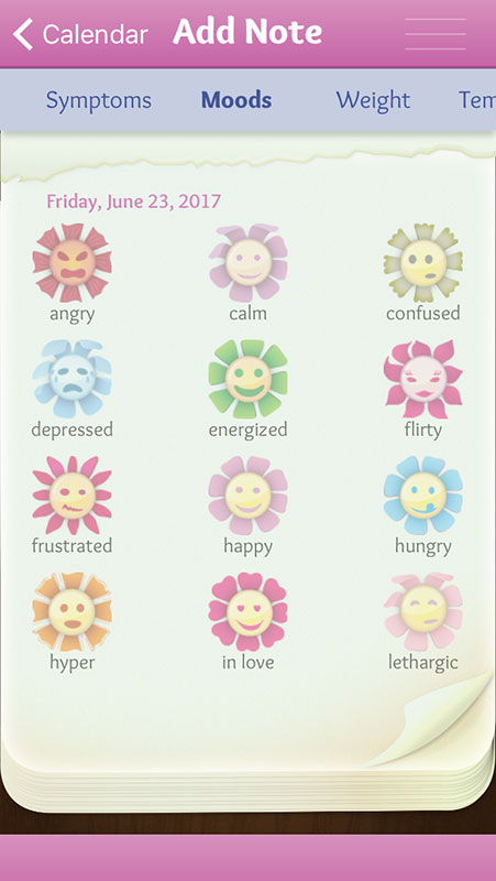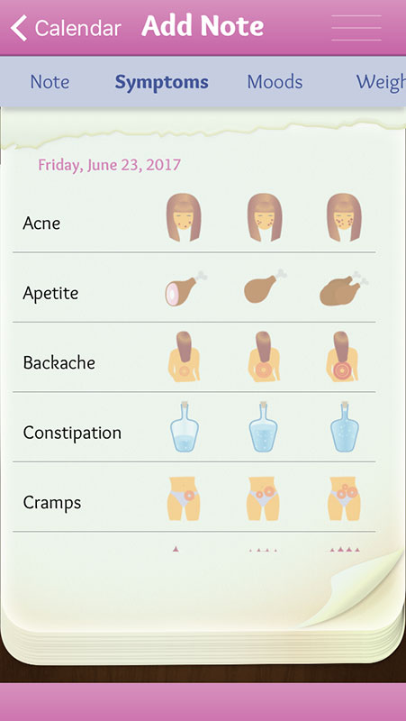 Symptoms include physical and mental, ranging from acne and appetite to crying spells and anxiety. There are three choices for each symptom that you could use to best describe how you feel on a particular day. If you don't feel some of the symptoms, you can simply skip it.