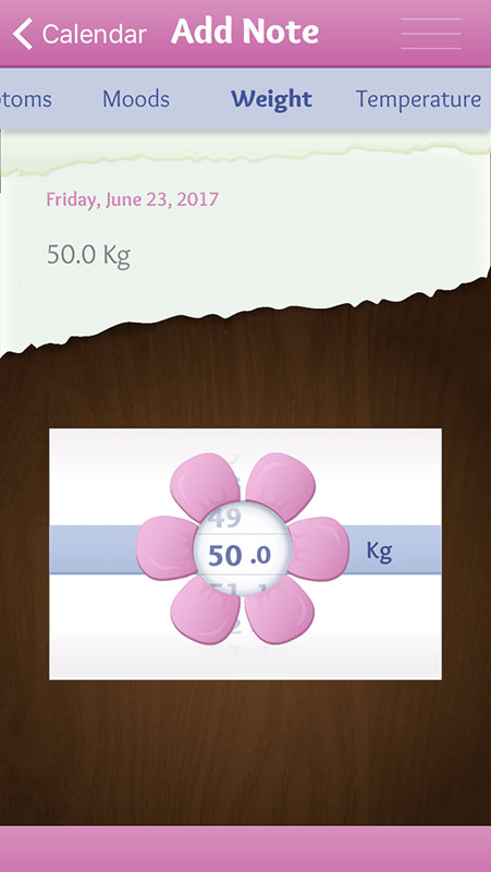 If you tap on Calendar, you'd see the current month, with period days marked with a bit darker color than regular days, fertile days with little orange flowers, or the day of the ovulation with pink/purple flower. To add entries for the particular day, simply double-tap on that day in the calendar and start adding things you want to track. Period Diary app lets you track symptoms, moods, weight, and temperature.