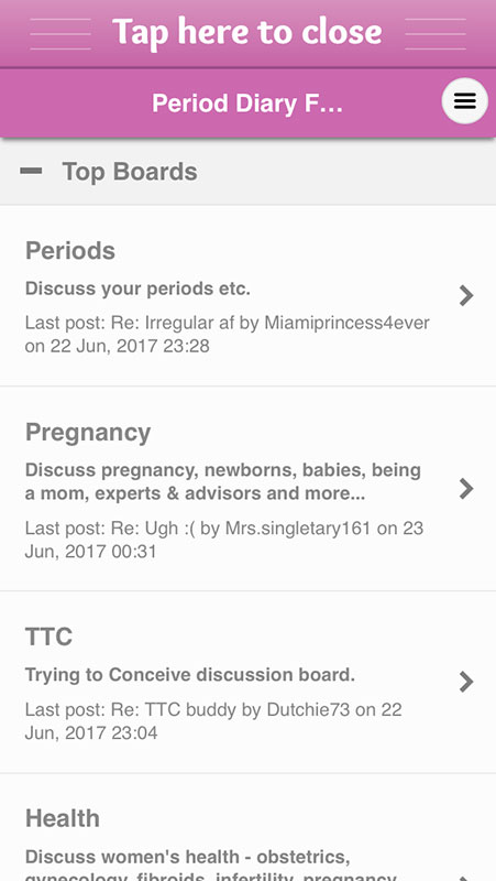 Period Diary app allows users to connect with other users by participating in forum discussions, where they could ask questions or share their own experience. Of course, this would require registering an account.