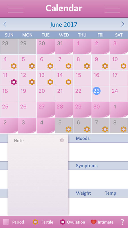 As its name suggests, Period Diary app lets you lead your own personal diary, by enabling you to add notes for each day. You can keep the notes strictly related to your period and cycle, or you can use it to write down anything you want. Each note contains a little heart symbol that can be checked, indicating discreetly that you had sex on that particular day.