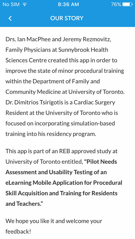 A family practitioner from Canada named Dr. Jeremy Rezmovitz along with his colleague Ian MacPhee developed a free mobile app for family physicians called Proceducate, as a part of a pilot study by the University of Toronto, aimed to improve the teaching and learning experience for minor procedures in Family Medicine.