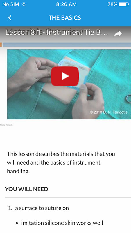 Once this step is done, you'd e taken to the main screen, which features Suturing 101 as the default category. Here you'd see several folders each containing instructional videos on how to improve suturing, including one-handed or two-handed techniques, instrument tie, the simple running suture and the running subcuticular suture.
