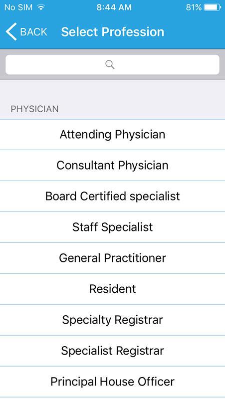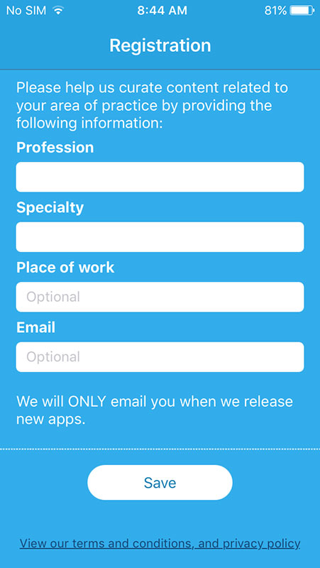 Upon downloading, the app will ask you to provide more information about yourself, including profession and specialty, and optionally your workplace and email.