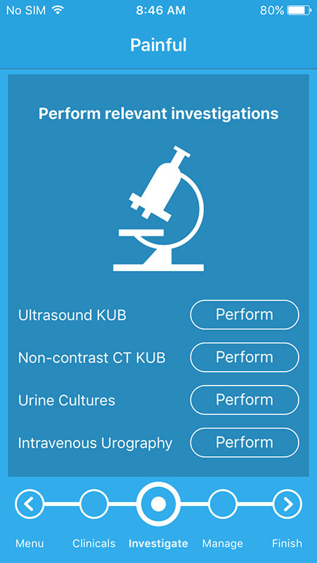 The next step in the case is Investigate section that allows students and providers to perform relevant investigations depending on the clinical scenario. Users need to decide which tests should be included based on the case summary, for example CT, blood count, ultrasound, medications, etc.