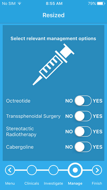 In the next step called Manage, users must decide on how the clinical scenario should be managed. Each case usually provides four options that could be multiple choice answers.