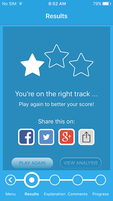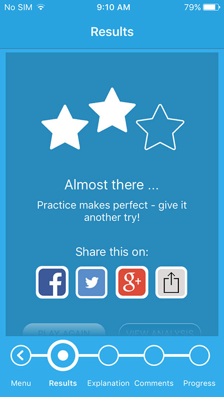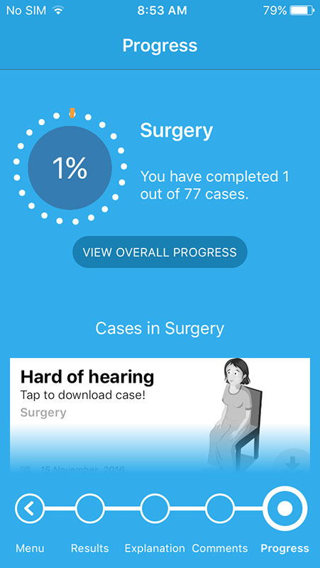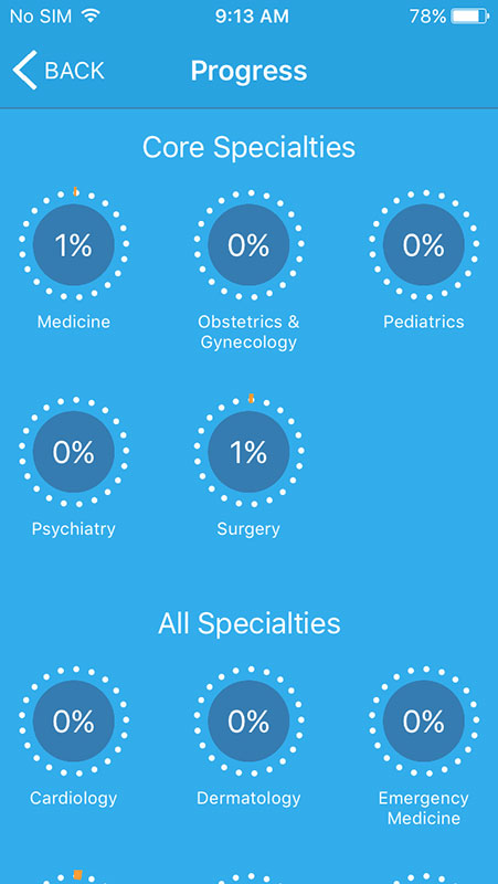 Finally, users have option to check their progress for that particular specialty, or to check their overall progress which links them to Progress section on the home screen.