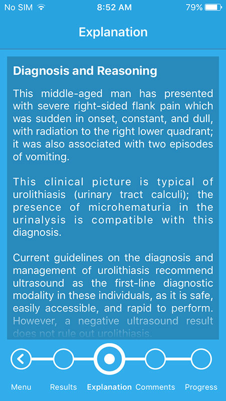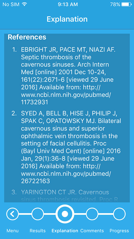 Prognosis: Your Diagnosis app then allows users to check explanations for each case, which are provided in detail, explaining the diagnosis and reasoning. Explanations are well referenced using information from multiple authority resources.