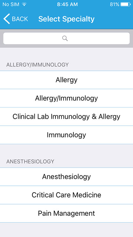 Here you can check specialties grouped in Core Specialties, including Medicine, Pediatrics, OB&Gyn, Psychiatry and Surgery, and All Specialties that list specialties from Cardiology to Urology and Vascular Surgery.