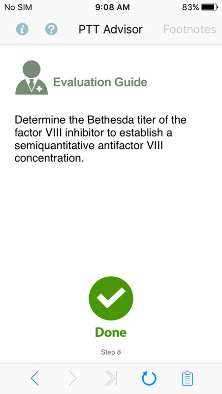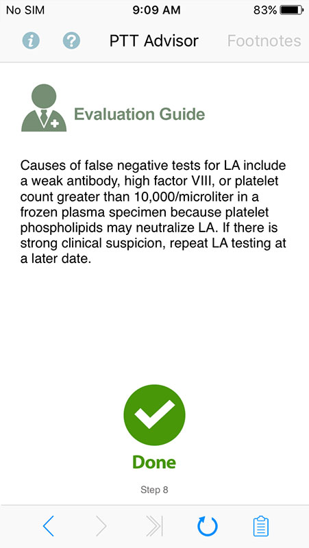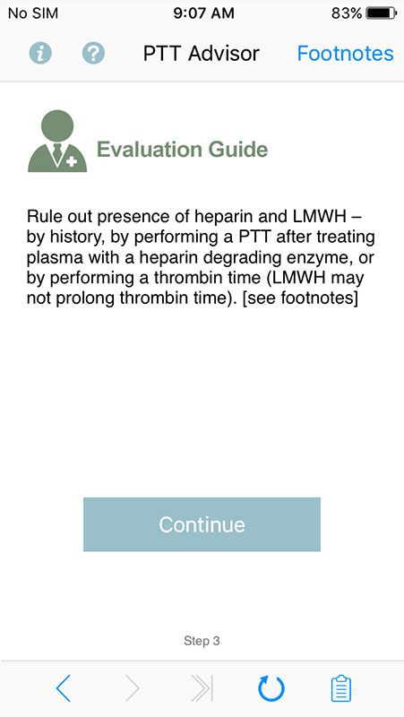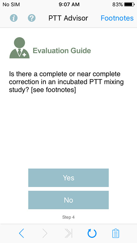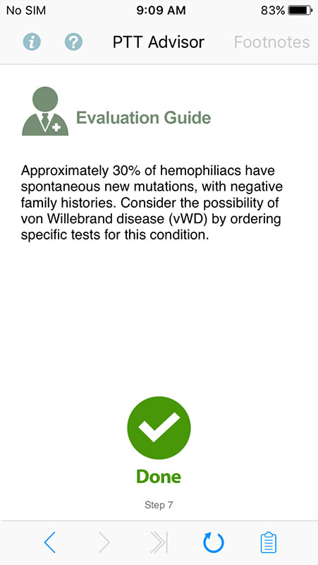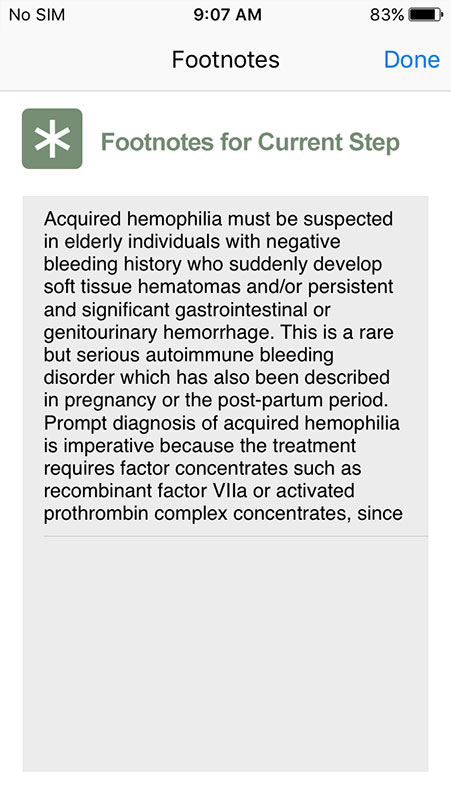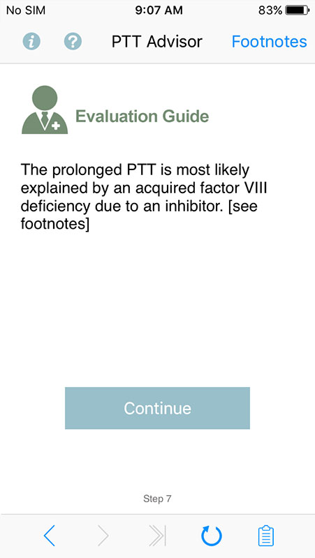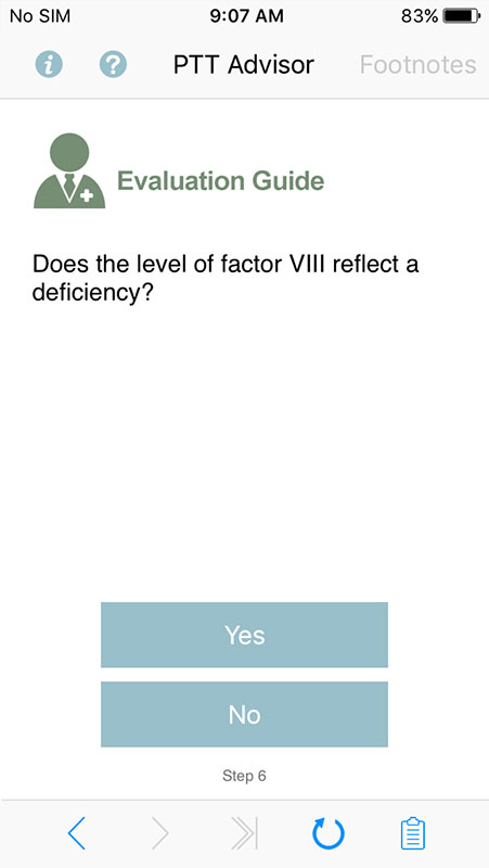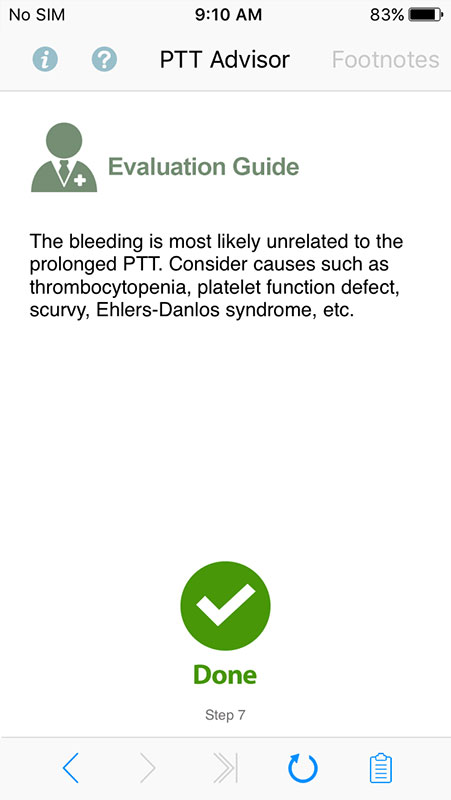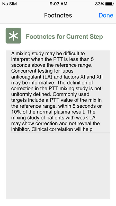 Based on users' answers, the app tailors further questions to help determine possible causes for a prolonged partial thromboplastin time, for both pediatric and adult patients.