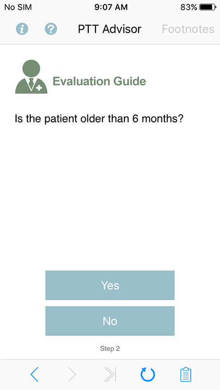 The app features a decision tree, which is designed as a series of Yes/No questions intended to guide providers quickly through the algorithm, thanks to the simple and easy-to-use interface.