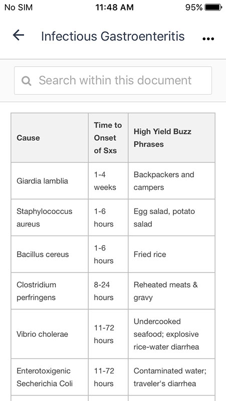 Gastroenterology covers only one topic, Infectious Gastroenteritis, which is also structured as a table with an overview of causes (different bacteria), time to onset, and high-yield buzz phrases usually connected to the particular type of bacteria (undercooked seafood, contaminated water, egg salad, etc.).