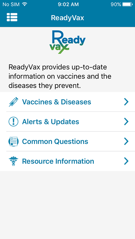 After selecting the role, ReadyVax app will open to the app's main screen featuring four sections, including Vaccines & Diseases, Alerts & Updates, Common Questions, and Resource Information.