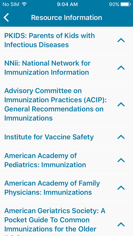 The last section in the app is Resource Information that contains the list of useful resources, such as Parents of Kids with Infectious Diseases, ACIP, Institute for Vaccine Safety, AAP, and more. There is a brief information about each resource with a link that leads to resource websites.