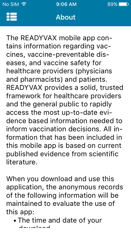 Overall, ReadyVax is a good app that disseminates information about a variety of vaccines and diseases to healthcare providers and general audience. In addition, it provides informational alerts and updates, which aren't the most up-to-date as the app creators claim.