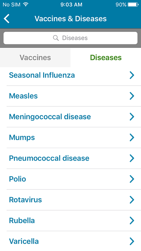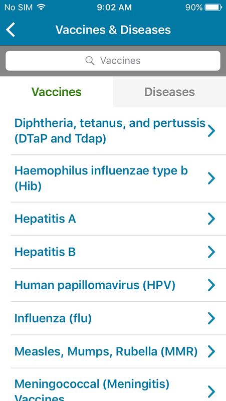 As its name suggests, Vaccines & Diseases section provides information about different vaccines and common diseases they treat. This section is divided into two tabs, one showing vaccines, the other diseases listed alphabetically.