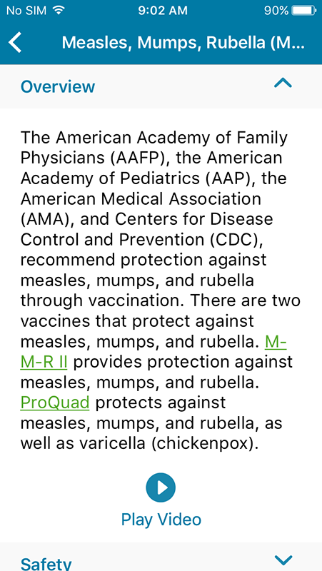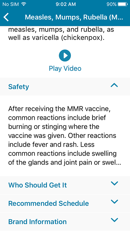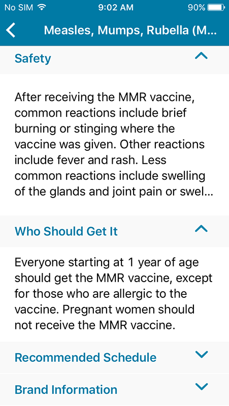 Tapping on vaccination would open a new page showing information about the vaccine, including overview, safety, who should receive it, recommended schedule, and brand information that also contains links to resources about the particular vaccine.