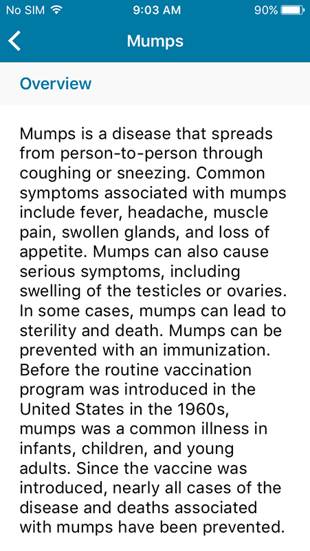 Diseases tab provide brief overview information about a particular disease, with a link to a preventative vaccine (in vaccines tab).